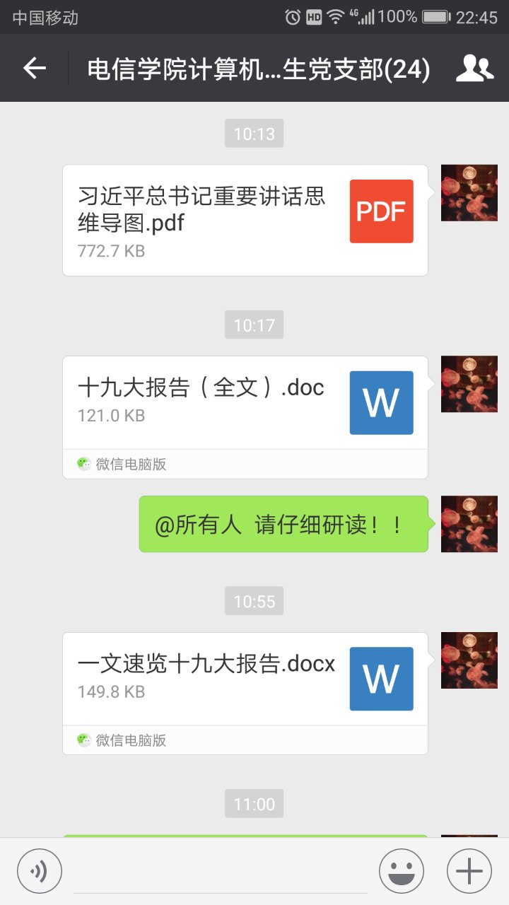 本次活动首先温习了十九大报告以及习近平总书记重要讲话的系列文件,之后则在支部内开展了十九大精神的网络答题活动,问答内容包括十九大精神、新修订党章等方面。