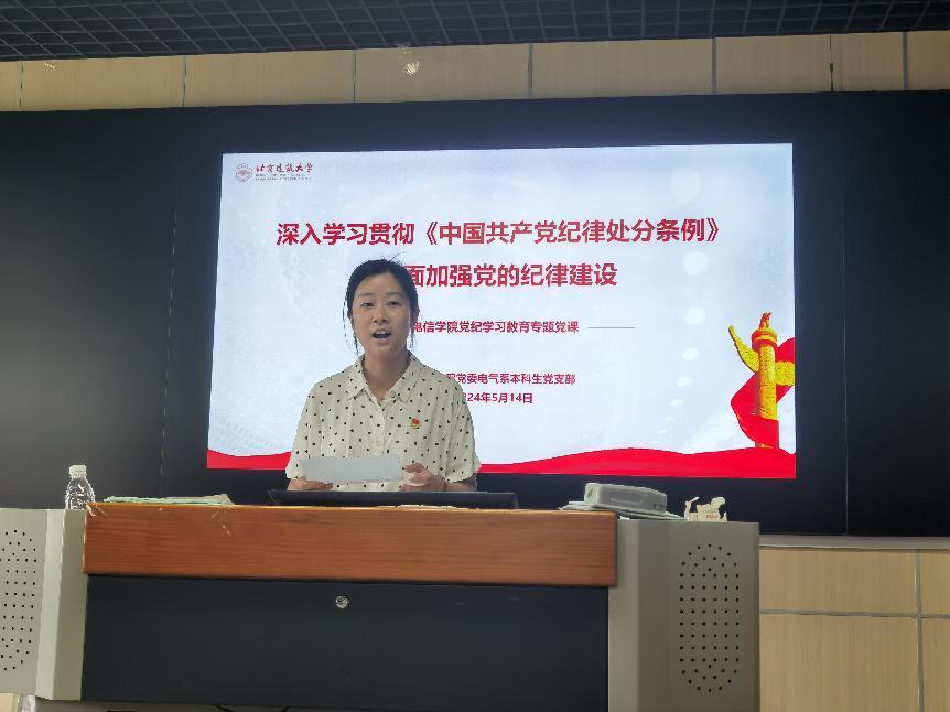 5月14日,电气系本科生党支部书记蒋丹为支部全体党员讲党纪学习专题纪律党课,深入学习贯彻《中国共产党纪律处分条例》。