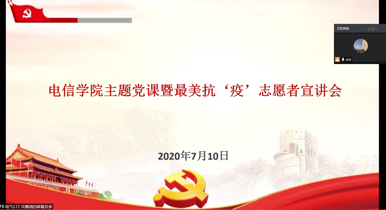 为了激励先进、鼓舞斗志,鼓励电信学院青年学子秉承北建大精神,继续发扬和践行志愿服务精神,持续在疫情防控阻击战中贡献青春力量,7月10日晚,电信学院在线举行主题党课暨最美抗“疫”志愿者宣讲会。WilliamHill党委书记张雷、副书记田芳、员工党支部书记、辅导员、最美抗疫志愿者代表、员工党员、团学骨干近100人参加了会议,会议由党委副书记田芳主持。