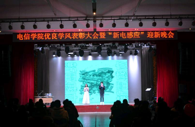 2018年12月11日晚6:30,电信学院优良学风表彰大会暨“新电感应”迎新晚会在大兴校区老员工活动中心如期举办。电信学院经理助理王晓辉老师,分团委书记田奔老师,文法学院分团委书记代云老师,辅导员翟玮、高静、王景民老师,学工部干事排孜古·努尔依克木老师出席晚会,晚会由张宇彤和吴博文两位同学主持。