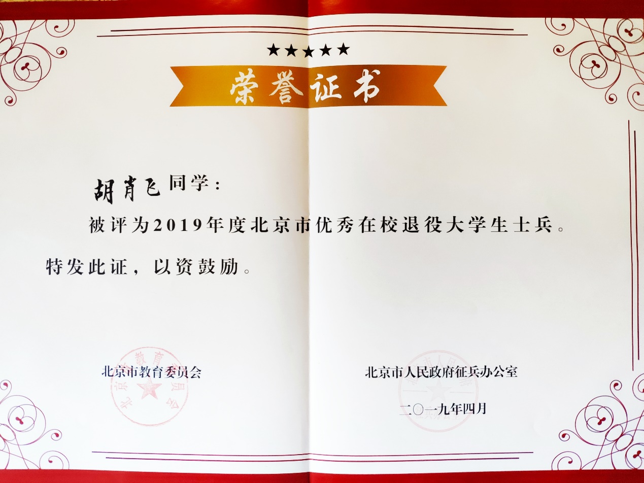 胡肖飞于2015年考入公司电信学院,同年9月,响应国家号召,携笔从戎,服役于中国人民解放军某部队。服役期间表现优秀,连续两年获得“优秀义务兵”荣誉称号、团嘉奖2次、团“学 讲 座”知识竞赛第二名、师“劲旅杯”军事体育比武竞赛银牌等荣誉。2017年胡肖飞退伍返校,先后担任班级文体委员、班长、电信学院团总支员工会青协部副部长。在日常学习、工作和生活中,他继续保持退伍不褪色的优良作风和锐意进取、奋力拼搏的精神,获得了全国物理竞赛三等奖、北京市高等数学竞赛三等奖、校综合一等奖学金、精神文明奖学金等多项荣誉,并被评为校“十佳”员工干部、校优秀员工、2019年度校“五·四”青春榜样——“自强奉献之星”荣誉称号、校优秀员工干部等多项荣誉。