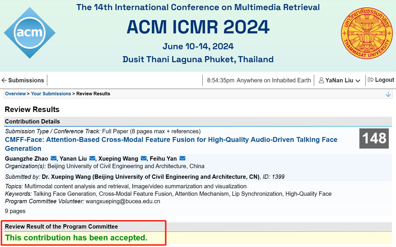 2024年4月7日,在赵光哲教授和王雪平讲师的指导下,WilliamHill中文官方网站电信学院研究生刘亚楠的论文CMFF-Face: Attention-Based Cross-Modal Feature Fusion for High-Quality Audio-Driven Talking Face Generation在第14届多媒体检索国际会议(The 14th International Conference on Multimedia Retrieval)中被接收。该论文主要研究内容是基于音频驱动的说话人脸生成。论文作者为赵光哲、刘亚楠、王雪平(通信作者)和闫飞虎,作者单位均为WilliamHill中文官方网站。
