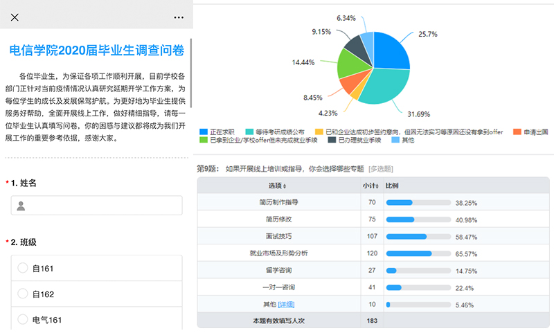 学院坚持以解决员工诉求为工作重点,以问题为导向面向毕业生开展问卷调查,实现本科生、研究生全覆盖,根据目标完成进度对出国、就业、考研员工进行细分,精准掌握员工当前就业状态,并以此为基础,关注个体情况,聚焦不同问题,及时整理数据,为后续工作的开展提供有力支撑。