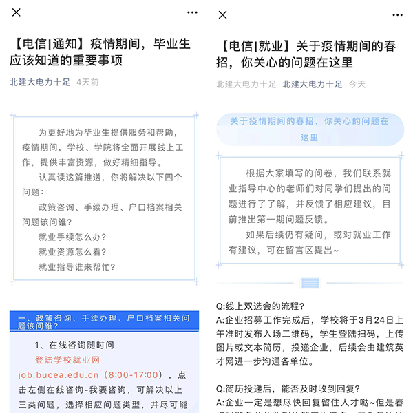 面对即将到来的线上招聘新模式、网络办公新趋势与云端辅导新形式,学院为员工对接资源,整合信息,为毕业季做好充足准备。做到就业信息有来源,员工可在就业信息微信群及相关公众号及时获取相关信息;就业指导有组织,依托就业指导中心主题咨询群,确保有相关问题员工获得支持;就业问题有回应,针对同学们关注的就业手续办理、春招计划等推出系列推送。