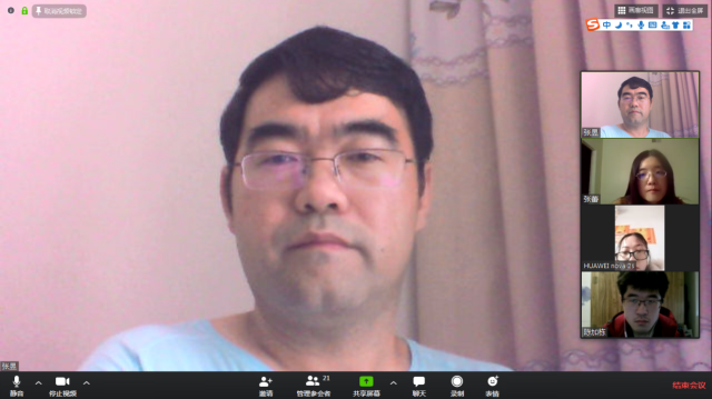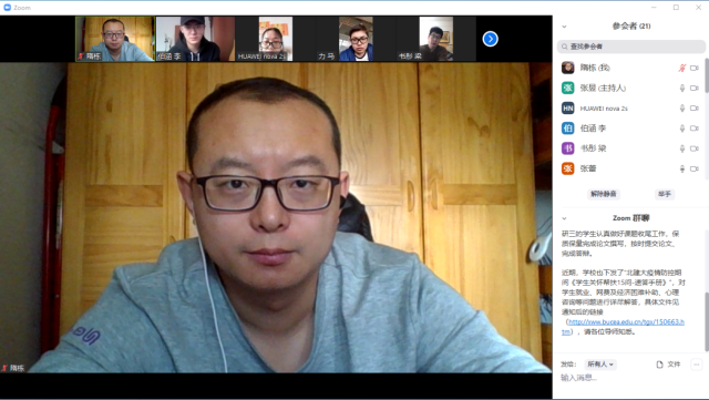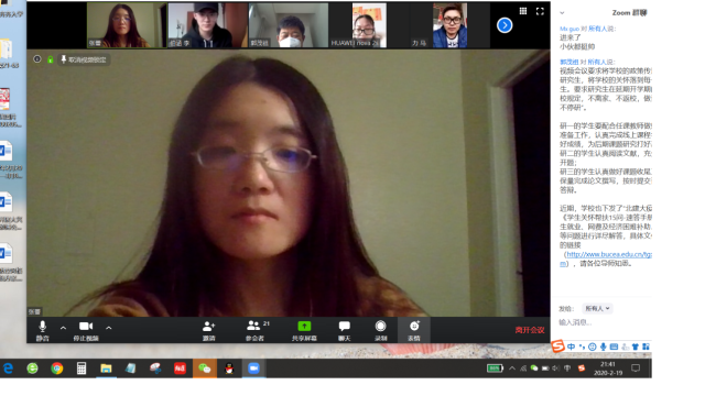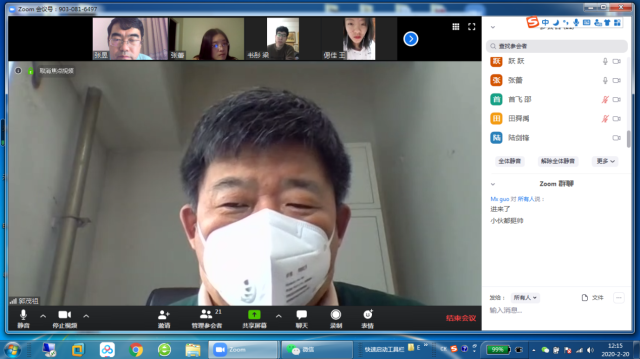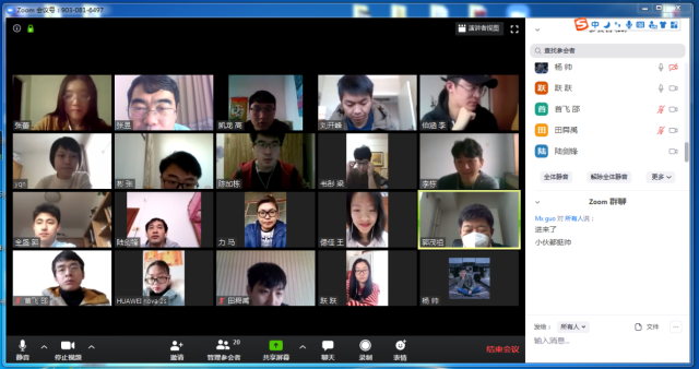 2020年2月20日12:10分,电信学院部分教师和研究生利用Zoom软件召开了一次网络视频会议。参加会议的有电信学院经理郭茂祖教授、张蕾、张昱、隋栋老师,以及各位老师的博士研究生、硕士研究生,共计21人。