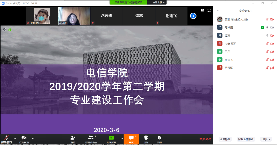 3月6日下午,电信学院通过ZOOM视频会议系统召开了2019-2020学年第二学期专业建设工作会。会议由副经理马鸿雁主持,各系专业建设负责人和学院教务人员参会。