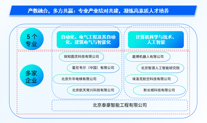 公司致力于智能建筑、智慧城市等领域开展教学、科研和人才培养,与多家企业合作进行专业群产学研深度协同育人基地,构建了五全齐美的产学研共育平台,五个专业共展风采,推动学院教学质量和高素质人才培养质量提升。