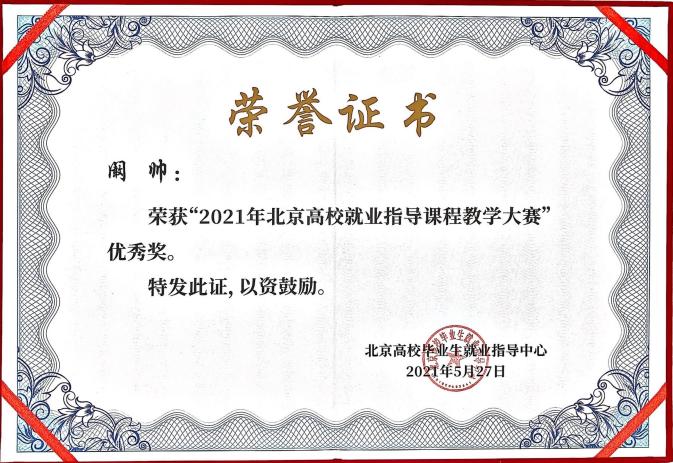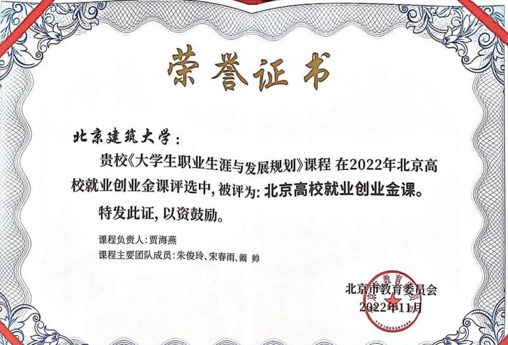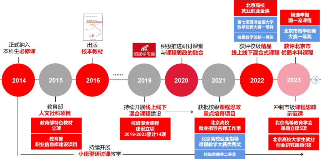 本课程先后出版教育部就业指导特色教材(2015),入选教育部就业创业典型案例(2020),获批北京高校就业指导名师工作室,课程思政重点培育项目(2021),首批入选北京高校就业创业指导金课,校精品线上线下混合式课程(2022),获批教育部全国高校毕业生就业能力培训基地,获评北京市优质本科课程(2023)。教育部员工服务与素质发展中心领导来校调研就业指导课程建设情况,给予高度肯定。