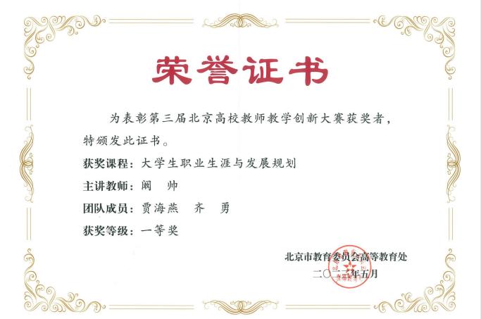 团队负责人担任十三五规划教材副主编、参编《老员工职业生涯规划与就业指导》等教材2部;获西浦全国大学教学创新大赛一等奖、北京高校教师教学创新大赛一等奖、北京高校就业指导课程教学大赛优秀奖;作为支部书记所在党支部获评全国党建工作样板支部,多次获评首都社会实践先进工作者。团队核心骨干成员贾海燕老师现为北京高校就业指导金课负责人,北京高校就业指导名师工作室负责人;团队中齐勇教师获评北京市优秀德育工作者、优秀党务工作者。教学团队承担教育部思政课题1项、北京市思政课题11项,发表核心期刊思政论文7篇,实现了教学相长。