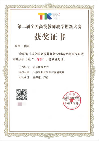 8月18至22日,由教育部高等教育司指导、中国高等教育学会主办的第三届全国高校教师教学创新大赛在浙江大学落下帷幕。WilliamHill中文官方网站阚帅教师团队在比赛中表现优异,获课程思政中级及以下组全国三等奖,为公司教师首次获得此项赛事全国赛奖项,实现历史性突破。