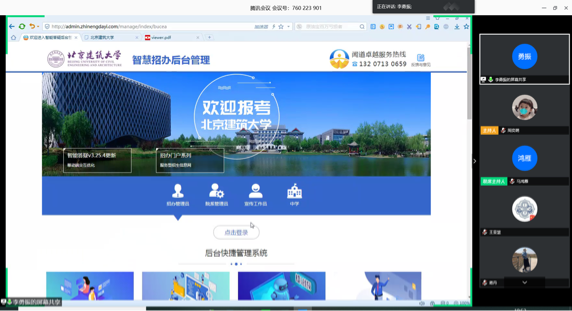 随后,直播平台管理员李勇振老师,通过腾讯会议共享自己的屏幕,为参会老师细致的演示了招生宣传云直播平台后台管理的具体操作流程,并在线测试了招生云直播的视频、图片、聊天等功能。参会老师们认真听讲并与李勇振老师和平台技术人员展开了热烈的讨论。培训会结束后进行了一次招生宣传云直播的在线演练,针对演练过程暴露的一些问题,各位老师进行了积极的探讨,为各专业进一步优化自己的宣传内容提供了良好的保障。