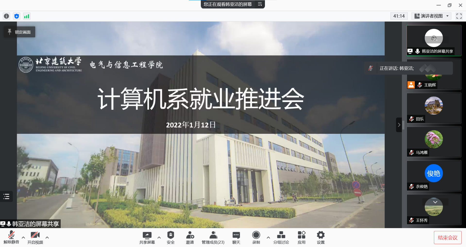 结合学校十四五规划和本科人才培养工作会的精神,马鸿雁副经理整体回顾了本学期学院及各专业在一流专业认证、国家级/北京市一流专业申报、教学研究成果总结和教学成果奖申报、招生宣传工作及三风建设等环节中的成果和问题,并就2022年的重点工作进行了系统的部署。