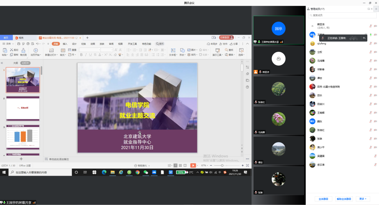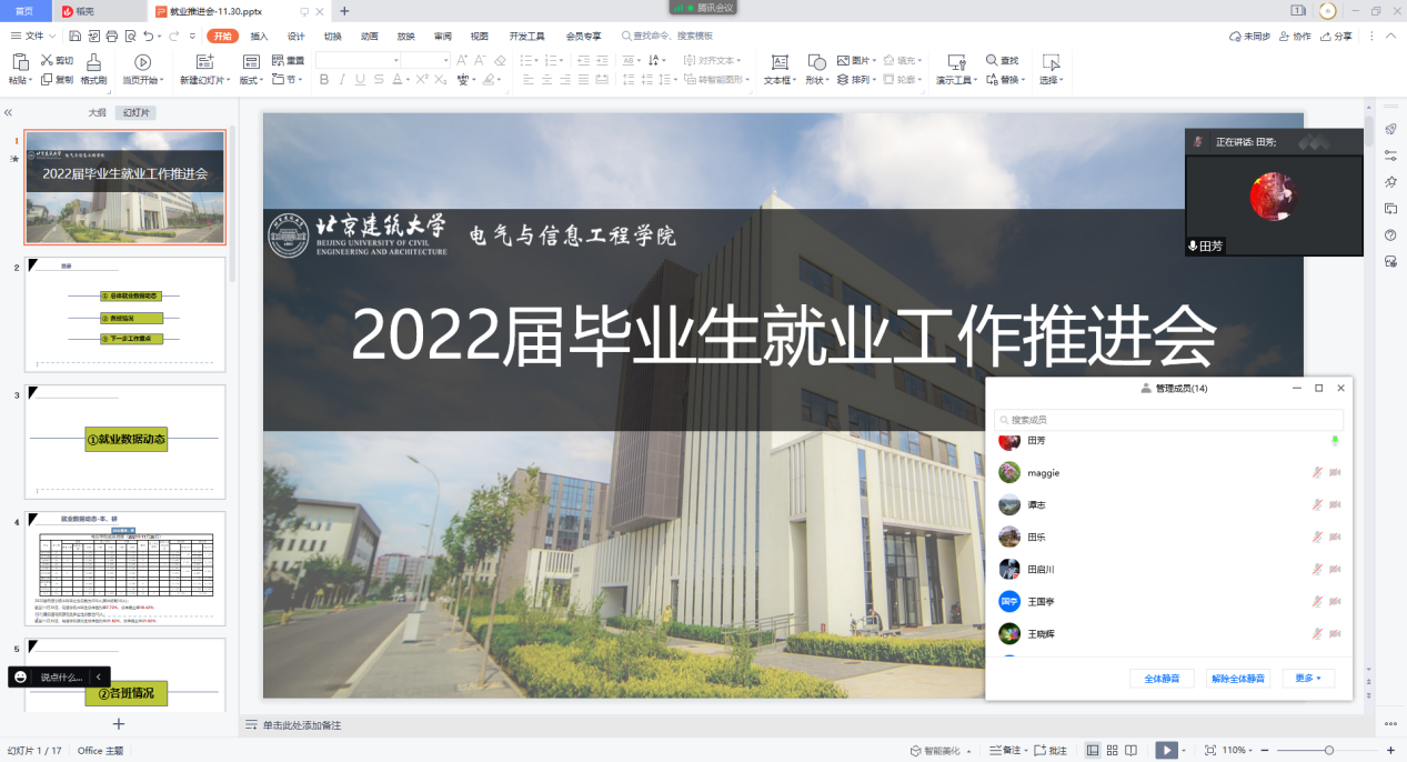 首先,就业辅导员韩亚洁围绕2022届本科毕业年级就业意向、重点关注群体情况、学风情况、就业工作目标等内容进行深入分析探讨。接着,就业指导中心王国亭分析了今年的就业、考研的形势,对员工“缓就业、慢就业”的现象进行了深入剖析,还解读了最新的就业政策,在就业指导过程中需要注意的问题等等。