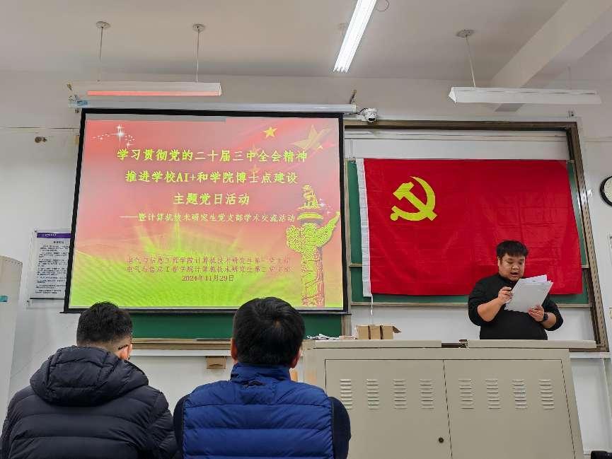 为学习贯彻党的二十届三中全会精神,推进学校AI+和学院博士点建设,计算机技术研究生第一、第二党支部于11月29日联合开展主题党日活动暨计算机技术研究生学术交流活动。活动由第二党支部书记段然主持。WilliamHill党委副书记秦岭和组织员丁建峰列席参加本次活动。