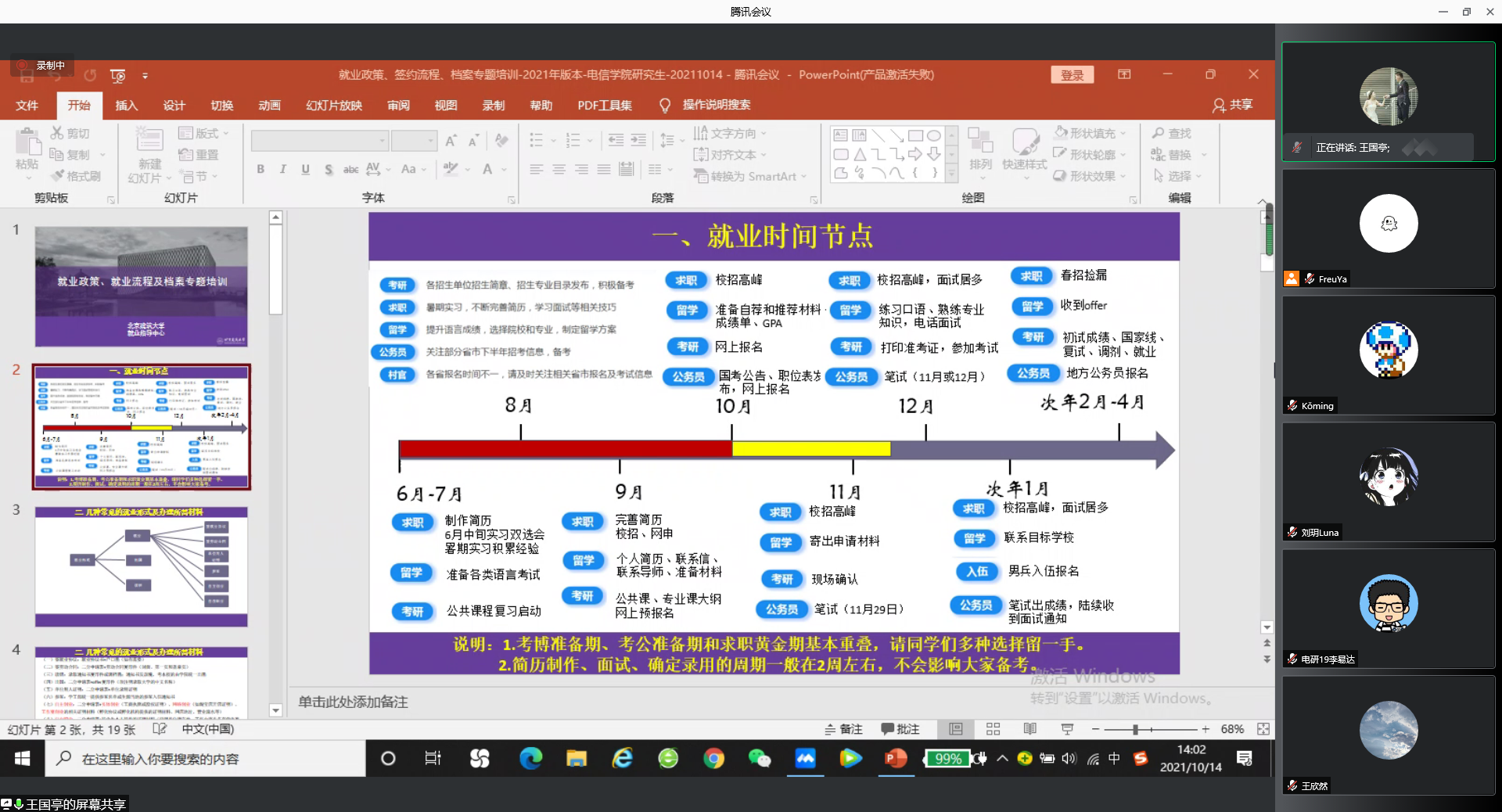 为做好毕业生就业工作,帮助同学们了解就业相关事项,10月4日下午15:00、10月14日下午14:00电信学院在线上分别召开2022届本科生、研究生就业政策说明会。会议由就业辅导员韩亚洁老师主持,就业指导中心杨益东、王国亭老师主讲,学院全体2022届毕业生参加会议。