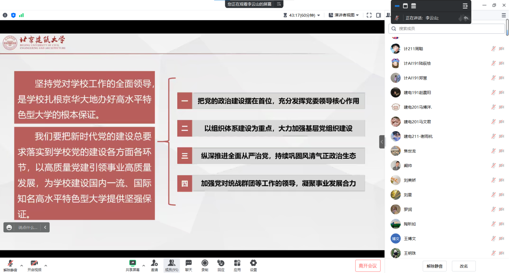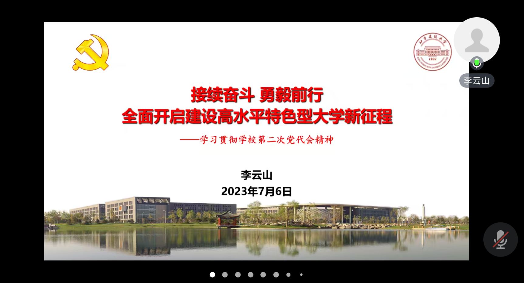 云山老师向大家展示了学校近5年来砥砺奋进取得的辉煌成就,在此基础上重点介绍了学院近些年取得的成绩,明确了在新时代新征程中学校发展的新目标新使命和学院今后努力方向。他强调,要实现上述目标,必须实施“党建领航”战略,坚定不移从严治党,把党的政治建设摆在首位充分发挥党委领导核心作用,以组织体系建设为重大力加强基层党组织建设,纵深推进全面从严治党持续巩固风清气正政治生态,同时加强党对统战群团等工作的领导,凝聚事业发展合力。