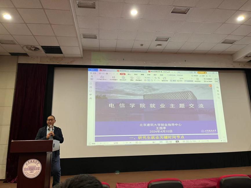 辅导员王景民介绍了电信学院研究生近年就业情况分析、征兵宣讲、就业资源、就业手续办理等内容。通过数据和实例,客观地分析了当前就业情况。鼓励同学们积极入伍,掌握各类就业资源,明确就业手续办理程序。