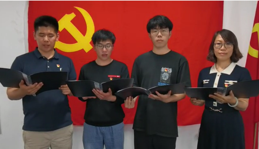 四位师生党员用响亮有力的声音、饱满的精神、丰富的情感朗诵完整篇诗歌以表达对中国共产党的尊敬和爱戴之情。