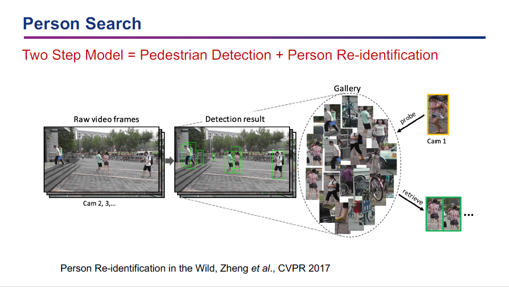 行人重识别是指给定一个监控行人图像,检索跨设备下的该行人图像,也属于图像检索的子问题。行人搜索结合了行人检测和行人重识别两个任务,因此也更贴近实际应用场景,在城市智能视频监控中有着重要的实用价值。秦老师主要介绍了其在计算机视觉领域顶级会议CVPR上发表的论文成果,包括与牛津大学的研究人员合作的一篇论文“Anchor-Free Person Search”。该工作开创性地提出了一个简洁有效的无需锚框(Anchor-Free)的行人搜索框架,其搜索精度全面超越以往基于二阶段检测器的框架,并且在保证性能的前提下达到了更快的运行速度。