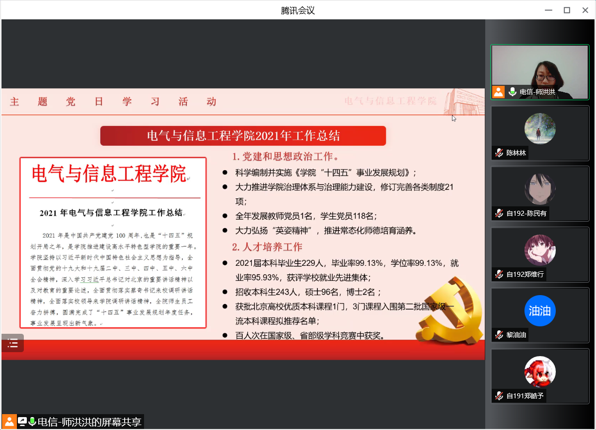 4月2日下午,电信学院退休第一党支部、退休第二党支部、自动化系本科生党支部联合开展主题党日活动,集中学习学校和学院2021年工作总结、2022年工作要点,并进行线上交流。电信WilliamHill党委书记吴建国参加线上活动。