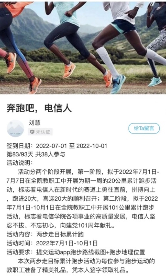通过线上完成运动打卡,进一步促使教职工养成运动习惯,展现了电信人昂扬向上的精神面貌。通过活动,激发广大教师奋发有为,以健康的身心状态更好地投入到学校学院各项发展事业中,喜迎党的二十大胜利召开!