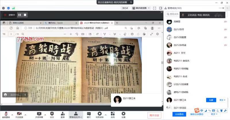 之后,刘爽又分享了她的母亲吴瀚女士的故事。母亲吴瀚1914年出生,1933年考上了清华大学九级生物系,后转历史系。1935年,为了反对华北自治,反抗日本帝国主义,要求保全中国领土的完整,在党的领导下,于12月9日和16日两次参与抗日救国示威游行,即“一二·九”运动。作为清华自行车队南下抗日宣传队唯一的女生,不畏艰苦,从不退却,经过1300多公里的艰难征程,车队胜利地到达了目的地—南京。国难当头,彻底改变了她的人生道路。1936年4月加入了中国共产党,在漫长岁月里不畏艰险,党指向哪里就奔向哪里,续写“一二·九”精神。之后作为新四军的普通一兵,兢兢业业工作,被大家誉称为新四军一师女战士中“三大女杰”之一。不仅如此,母亲吴瀚一生中获得许多荣誉,即使百岁高龄,也一直不忘党和国家,关心党和国家大事,每天读书、看报、看新闻。建党百年之际,国家图书馆副馆长陈樱向她颁发“光荣在党50年”纪念章。